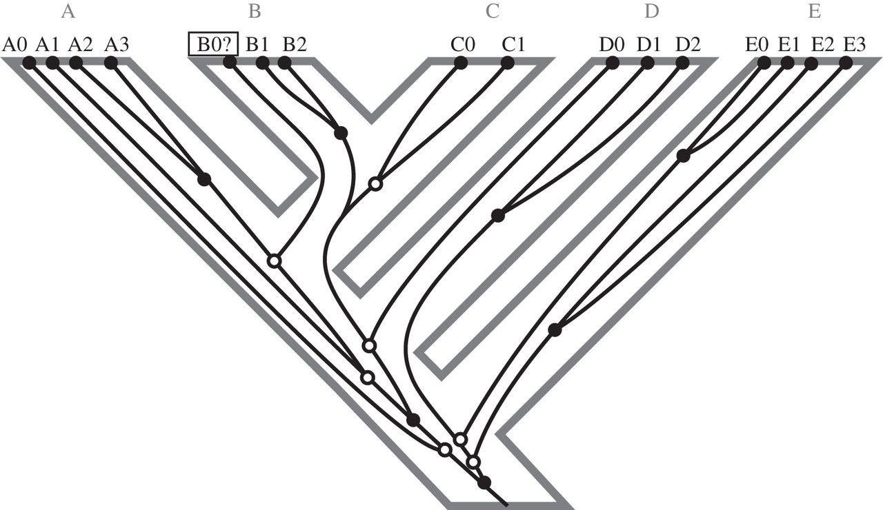 Gene trees denote the evolutionary relationship of genes that evolve within populations of species